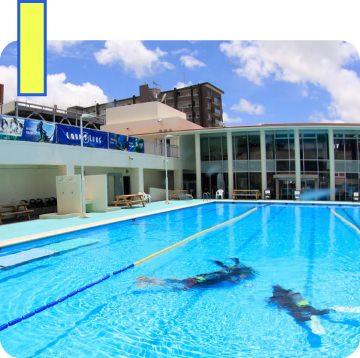 まずは、足の着くプールで練習してから、水深4mのダイビング専用プールに挑戦します。